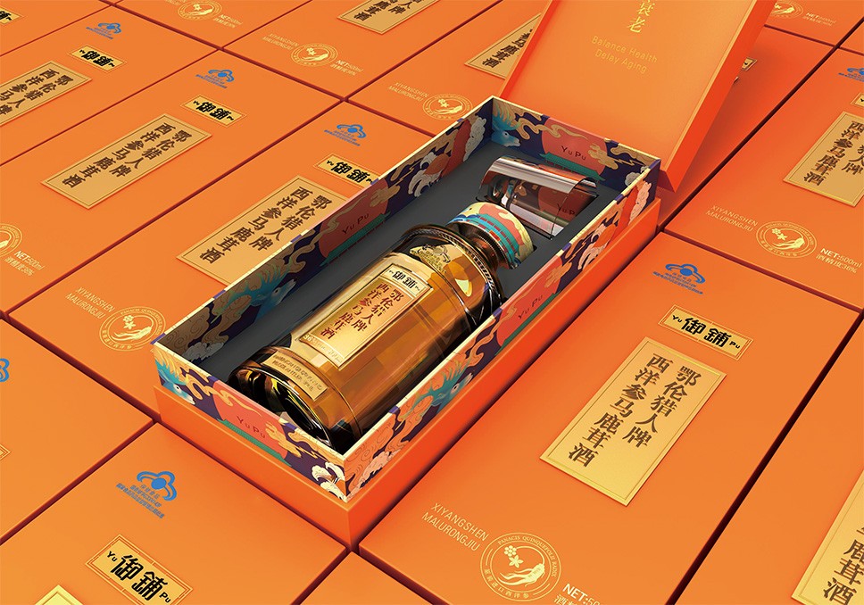 瓶口的圖案是由馬鹿茸、西洋參、中藥鋪、祥云、水紋等元素中提煉出來馬鹿茸,西洋參是中醫(yī)藥的珍品能夠體現(xiàn)產(chǎn)品的屬性;中藥鋪增加產(chǎn)品在醫(yī)藥中體現(xiàn)的價值感;祥云、水紋在傳統(tǒng)元素寓意祥瑞之云氣,表達了吉祥、喜慶、幸福的愿望以及對生命的美好向往,同樣把美好的寄寓應(yīng)用瓶口的包裝上。